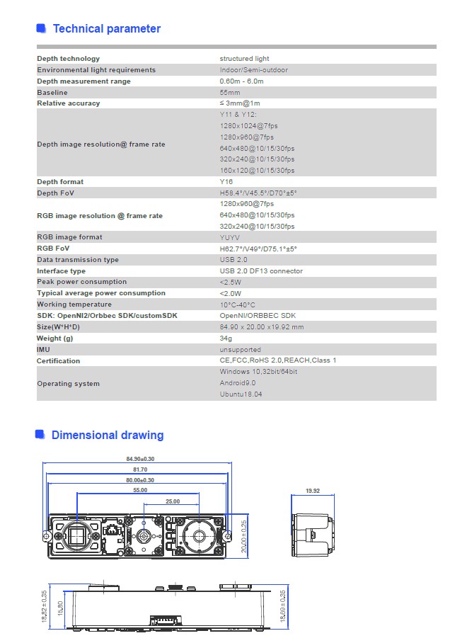 It supports up to 1280x1024 depth image, with multi-resolution D2C function, which can bewidely used in robot obstacle avoidance, volume measurement, game and entertainment and other application scenarios.
