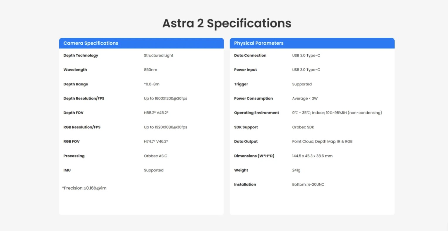 The upgraded Astra 2 3D camera, released in 2023, is the successor to the widely used Astra seres products. The camera is based on structured light technology and has been upgraded with the latest ORBBEC’s custom ASIC for high quality depth processing, IMU and multi-camera sync. The ORBBEC SDK makes it easy to setup and deliver extremely accurate and reliable data for in-door operation.