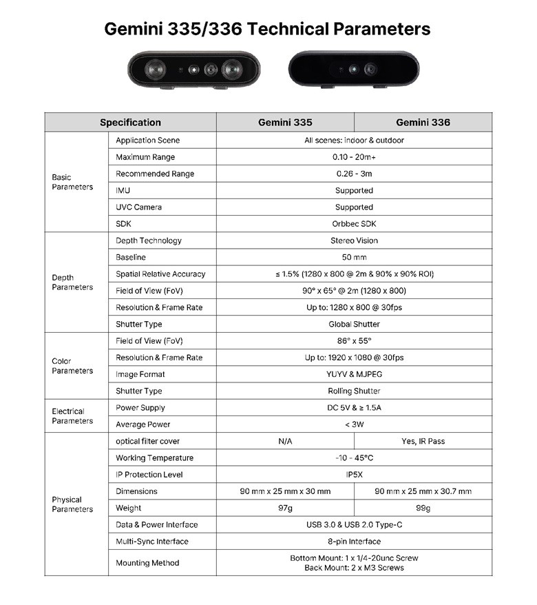 expands its product portfolio through modular extensions to flexibly meet the needs of diverse application scenarios. Gemini 335 is one of the flagship products of Gemini 330 series. It has a 50mm baseline and is IP5X rated. It is easy to set up and operate with the ORBBEC SDK and the camera delivers extremely accurate and reliable data in various lighting conditions, ranging from pitch black to outdoor environments.